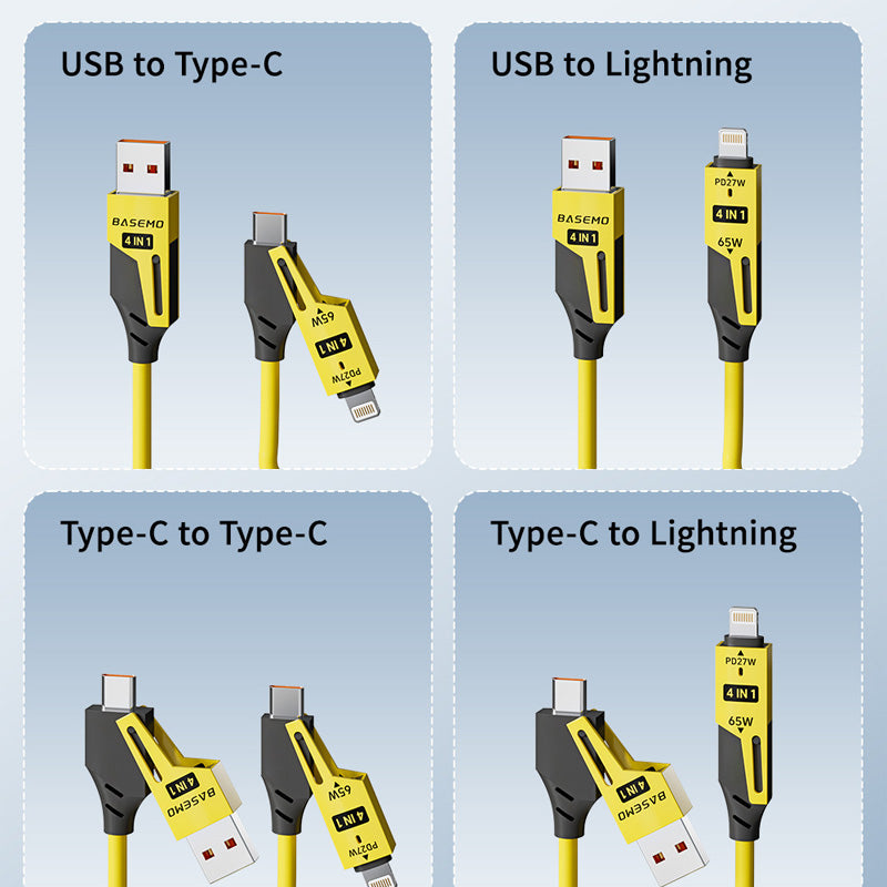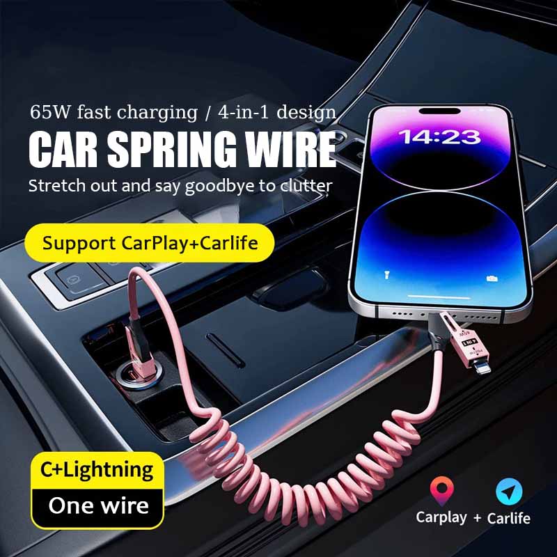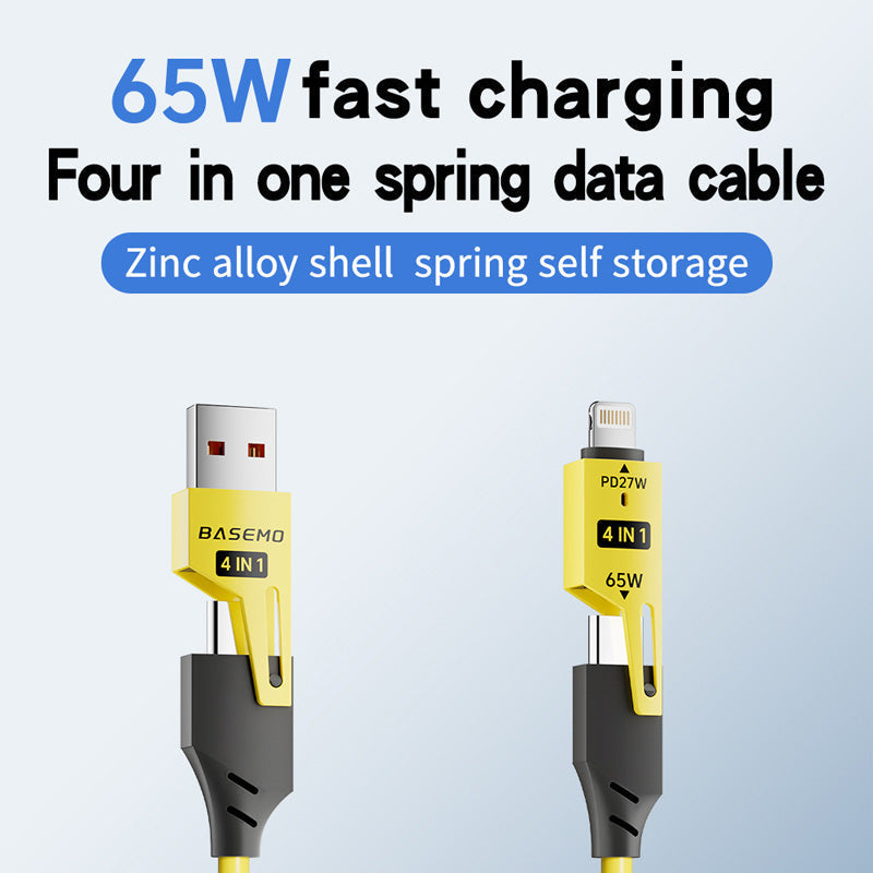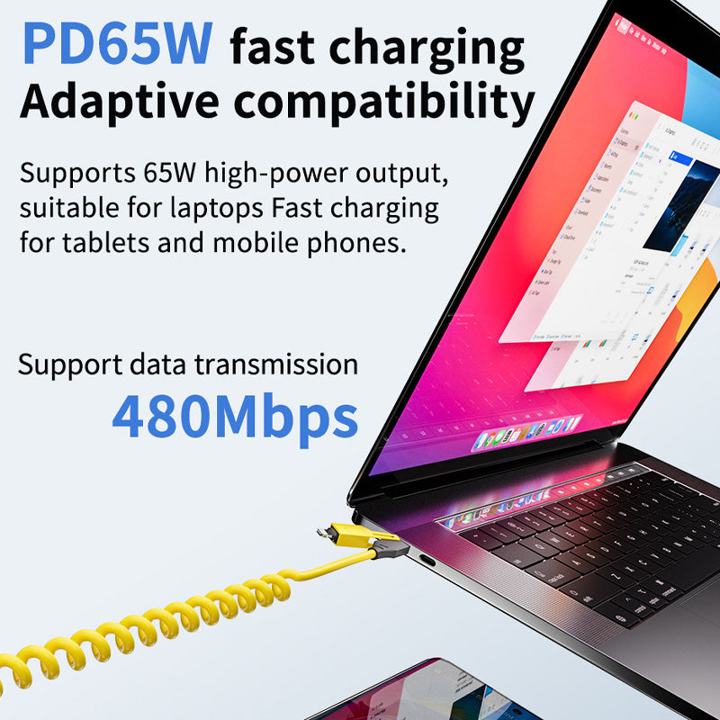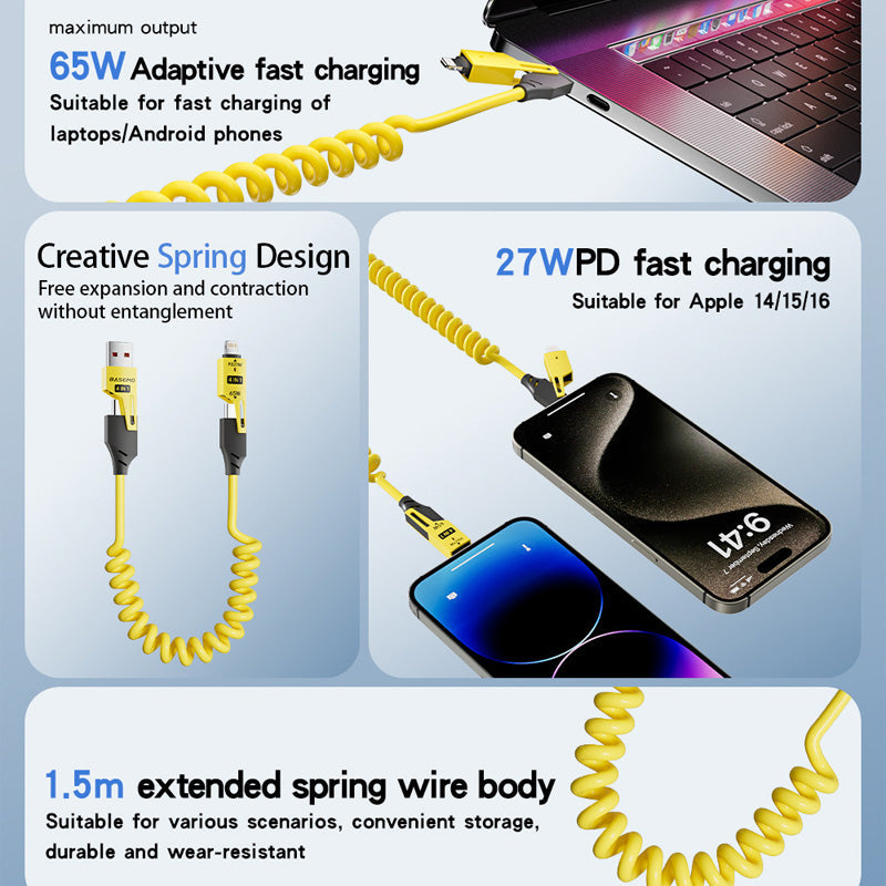 Denne 4-i-1-datakabelen med fjæruttrekk er utformet for effektiv lading og dataoverføring. Den støtter 65 W hurtiglading og passer til en rekke ulike enheter som bærbare datamaskiner og mobiltelefoner, noe som gjør ladeopplevelsen raskere.