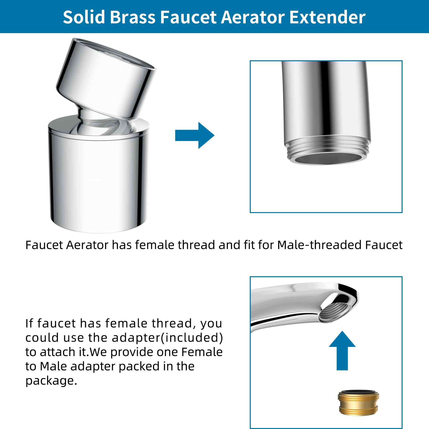Enkel å installere: Forlengeren til kjøkkenkranen har en innvendig gjenge som passer til kraner med utvendig gjenge. Hvis kranens gjenger har hunngjenger, kan du velge en adapter som passer til den. Vi leverer en adapter fra hunn- til hanngjenger med i pakken.