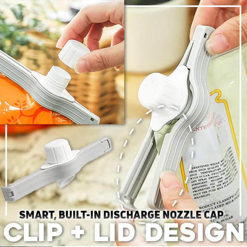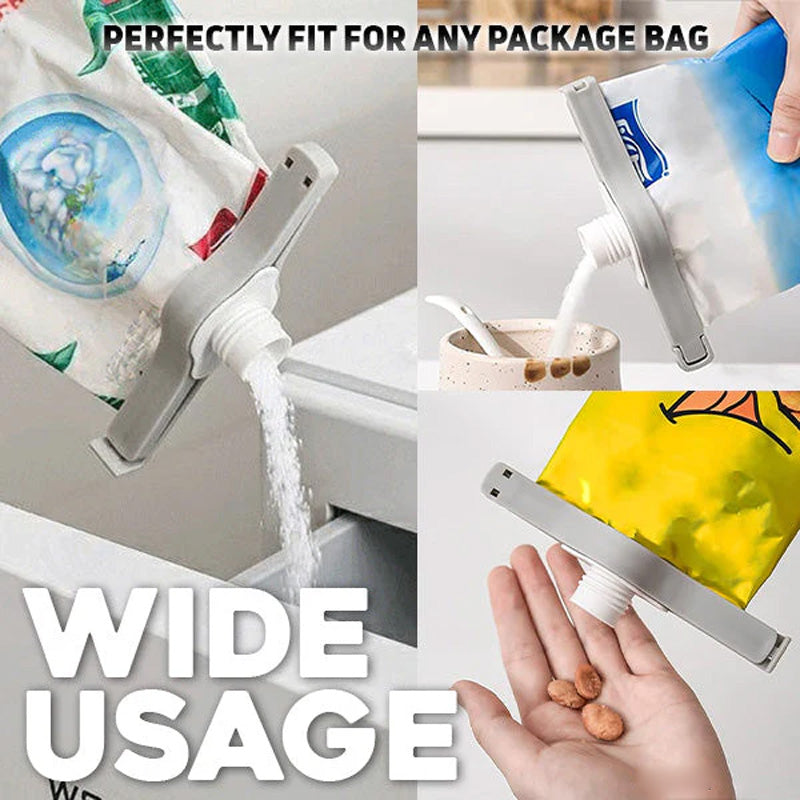 Denne flerbruksposeforseglingsklemmen kan enkelt lagre enhver pose i en lufttett låsing på kort tid. Bare klipp av enda et hjørne av emballasjeposen, stikk koppen gjennom hullet, åpne klipsen, fest deretter dysen ved å justere og knekke forseglingsklemmen. Etter det er det bare å vri hetten på munnstykket for å lukke, og du er ferdig. Ikke flere plastposer som ruller og behovet for å bruke gummibånd kun for å holde maten bedervet eller lekker ut. Dessuten kan forseglingsklemmen fjernes når som helst på plastposen og gjenbrukes flere ganger for å forsegle andre emballasjevarer.