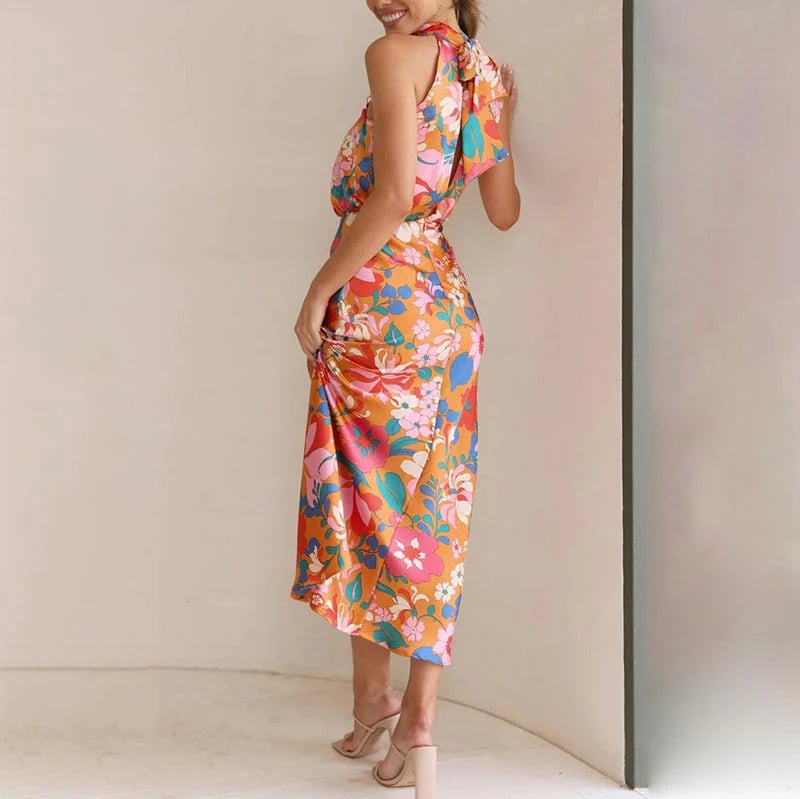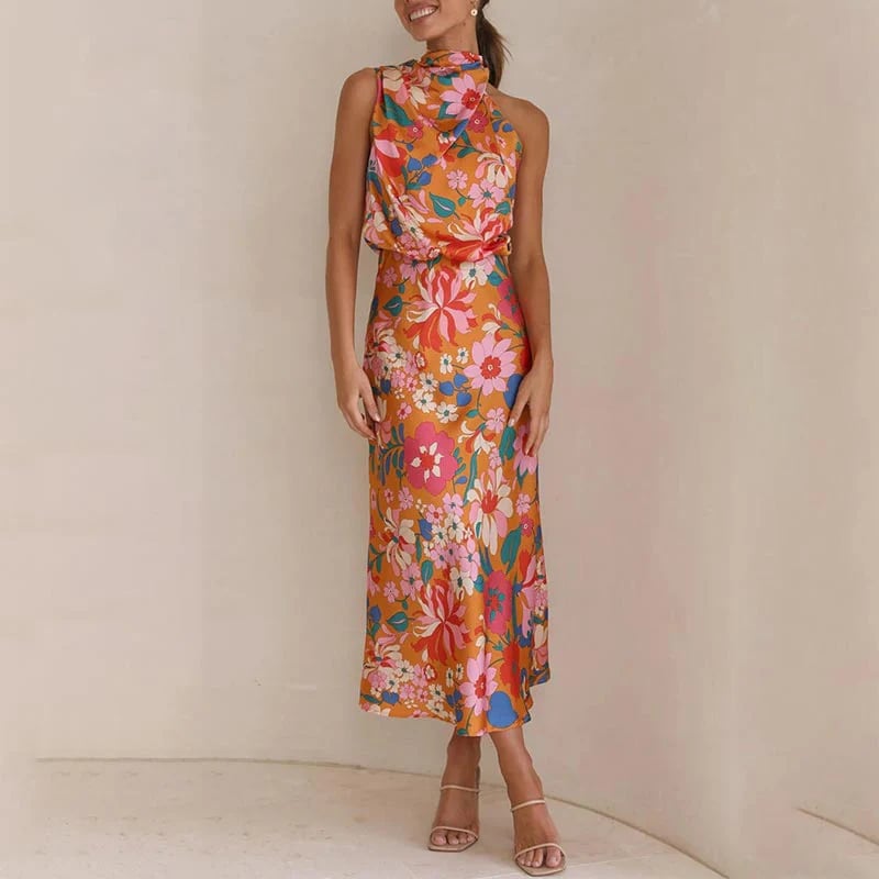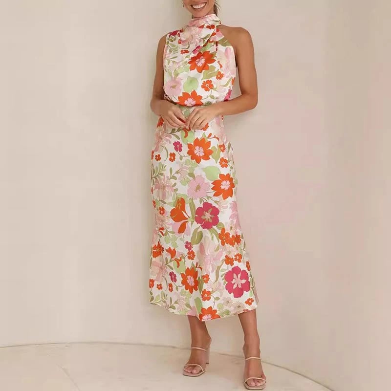 - 1 x Ermeløs knytehalstrykk i sateng med halterneck og elastisk midje og maxikjole