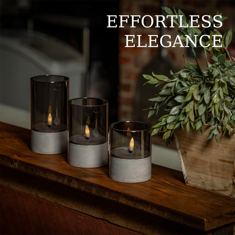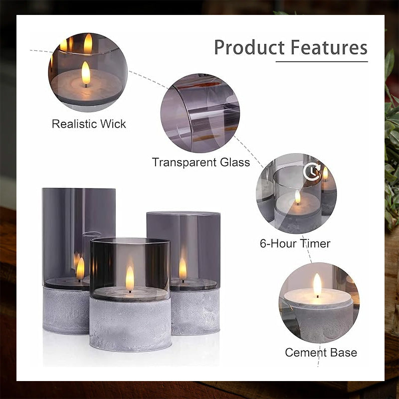 Forvandle rommet ditt med Gray Glass LED Candles, et sett med tre avtakbare gullglassdeksler i kombinasjon med sokler i sementimitasjon. Enten det er en uteplassfest, en koselig kveld ved peisen eller et avslappende bad, tilfører disse LED-lysene omgivelsene dine varme og raffinement.