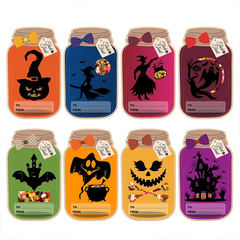 KREATIVE HÅNDVERKSKORT: Disse Halloween-håndverkskortene for barn har unike designkort med krukker og skarpe utskjæringer. De gjennomsiktige posene er perfekte til godteri, sjokolade, bakevarer og nøtter, og de sitter godt fast på kortene, noe som gjør dem ideelle til knask eller knep eller knask eller knep-fester.