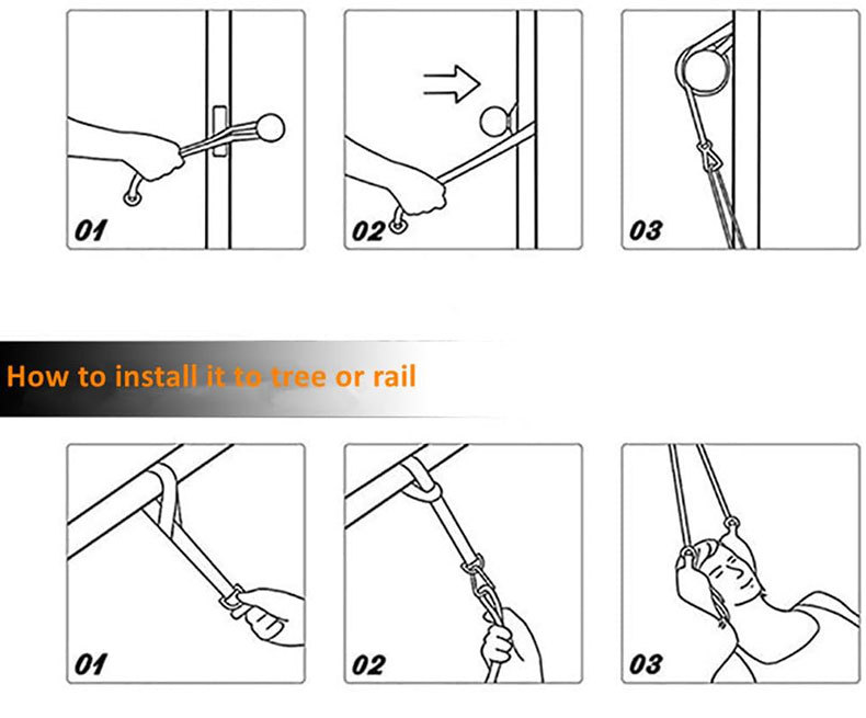 Justerbar stropp og spenne: Den justerbare stroppen lar brukere feste hengekøyen sikkert til en standard over-dør-armatur, noe som sikrer et stabilt og sikkert oppsett. Spennen muliggjør enkel justering av stroppens lengde for å tilpasses forskjellige dørstørrelser og brukerhøyder.
