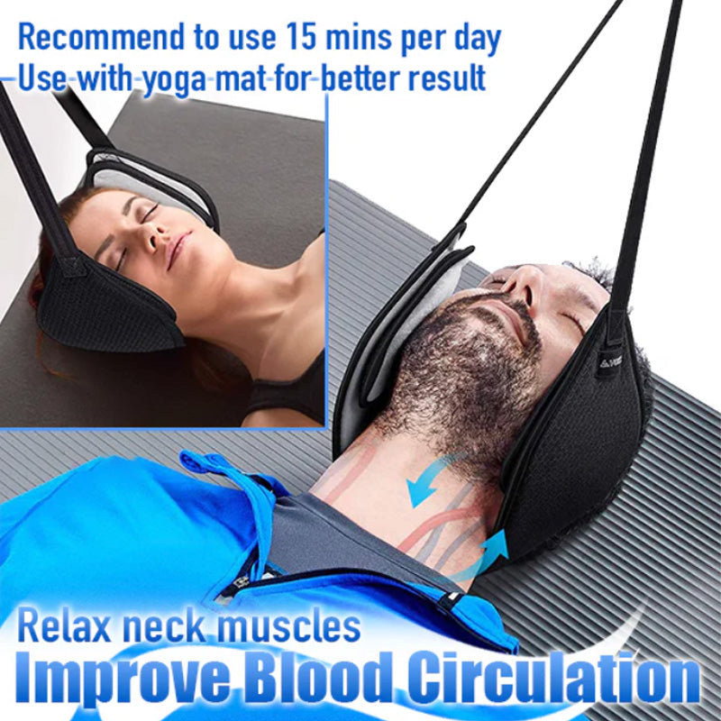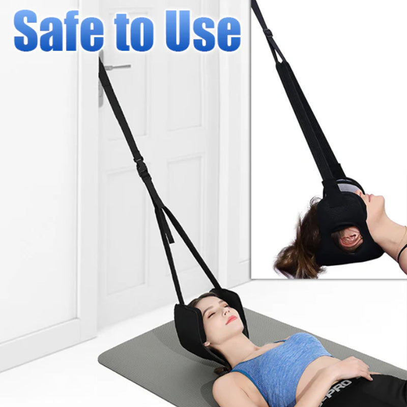 Polstret nakkestøtte: Hengekøyen har en kontur, polstret nakkestøtte som holder hodet og nakken i en komfortabel posisjon under tøyingsøkten. Polstringen hjelper til med å fordele trekkraften jevnt og minimere ubehag.