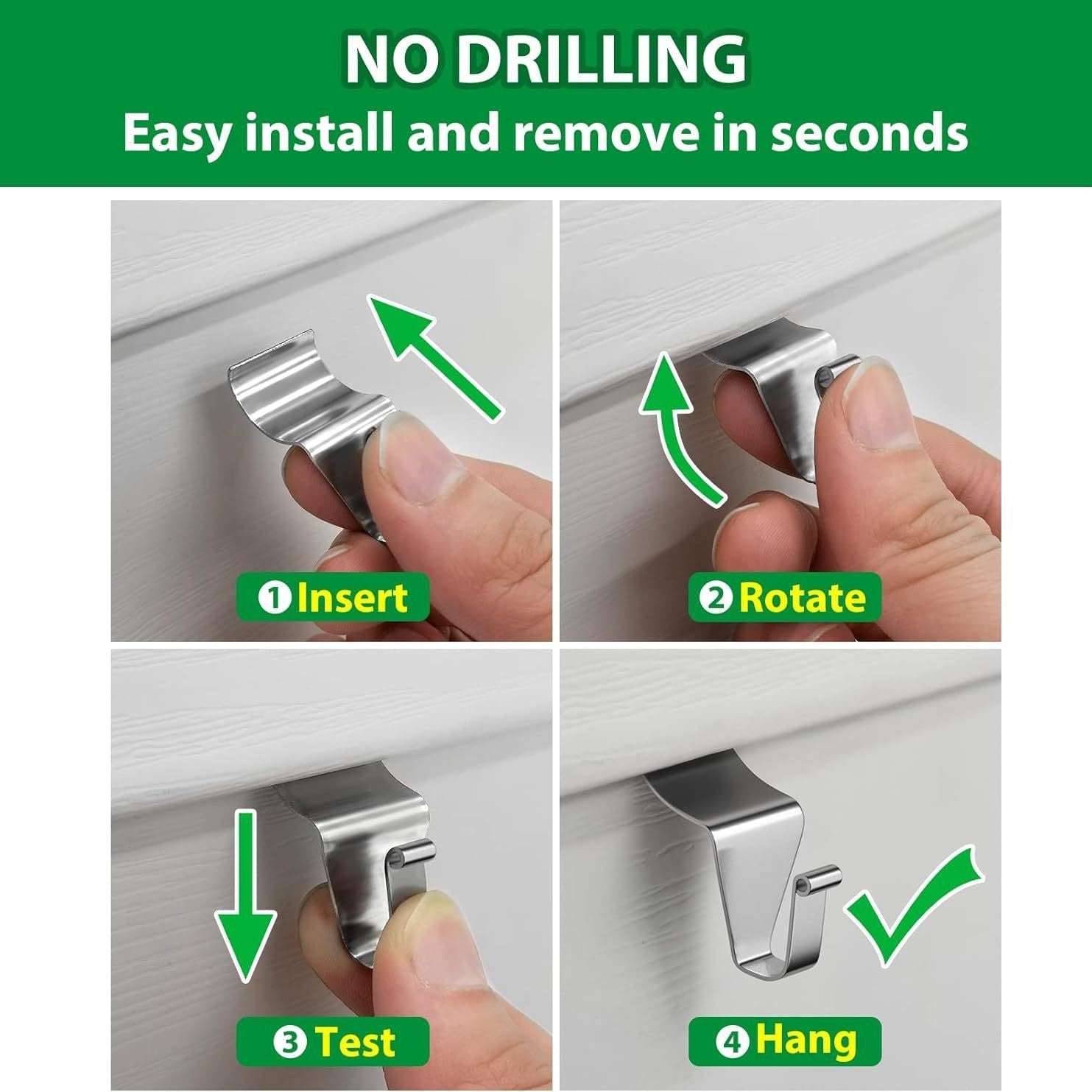 - Ingen boring eller bruk av skruer er nødvendig! Bare skyv krokene inn i åpningen mellom vinylkledningen eller veggpanelene, så er du klar til å sette i gang. Den skader ikke veggen, og monteringen tar bare noen sekunder.