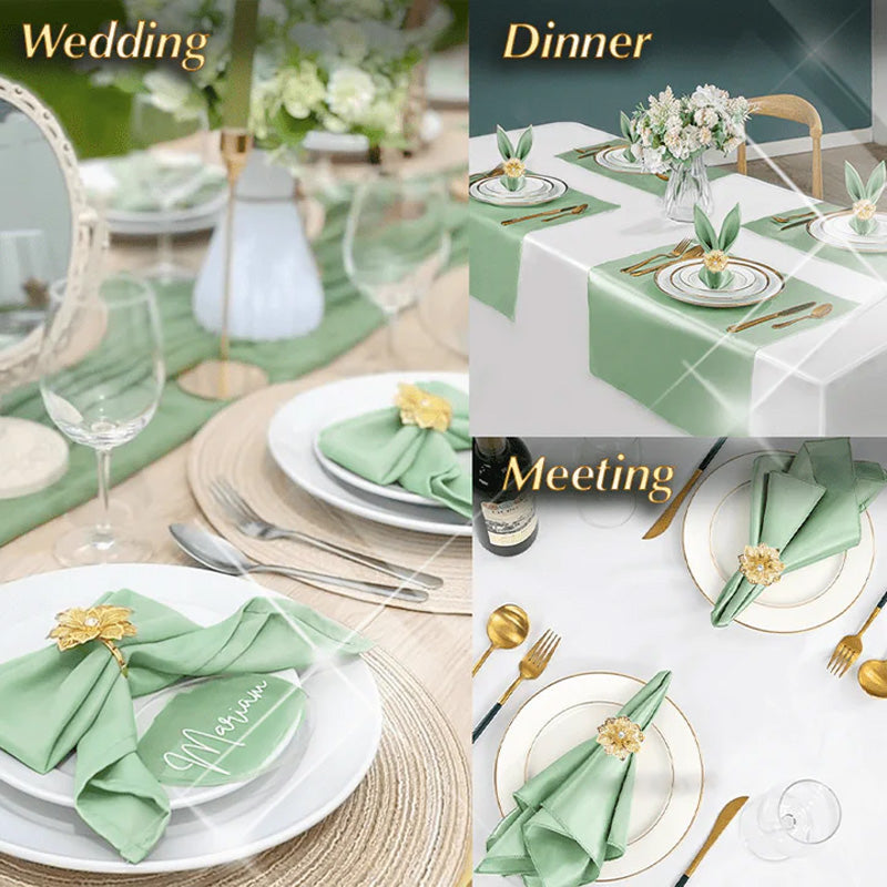 Et stilig blomsterbåndtilbehør som er spesialdesignet for hold dukene dine trygt på ett sted. Gir deg mulighet til å rulle servietten i en ryddig og organisert presentasjon uten å bekymre deg for at den skal løsne selv før bruk. Hva er mer? Denne serviettringen kan også bidra til å minimere risikoen for at håndkleet ditt glir helt av bordet og blir skittent under måltider. Bare rull servietten din, skyv den forsiktig over gjennom ringen for å holde den, legg den på bordet, og du er ferdig. Gjør det til et flott verktøy for å alltid ha bordserviettene for hånden, samtidig som den gir et dekorativt preg i motsetning til den vanlige, kvadratiske brettede servietten.