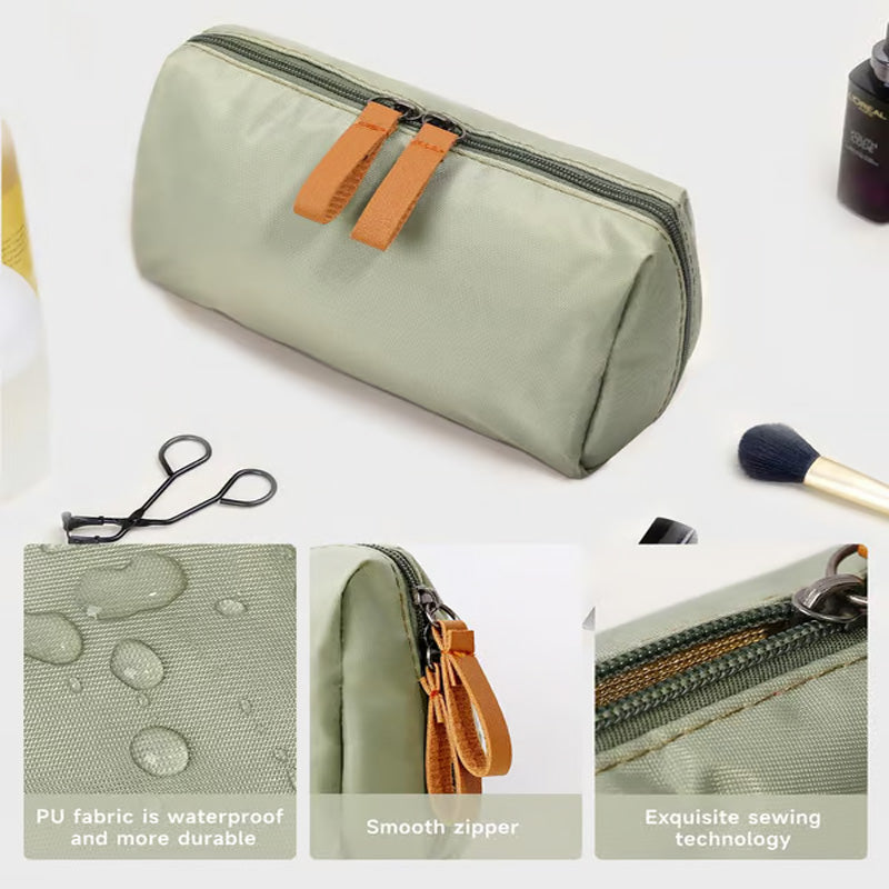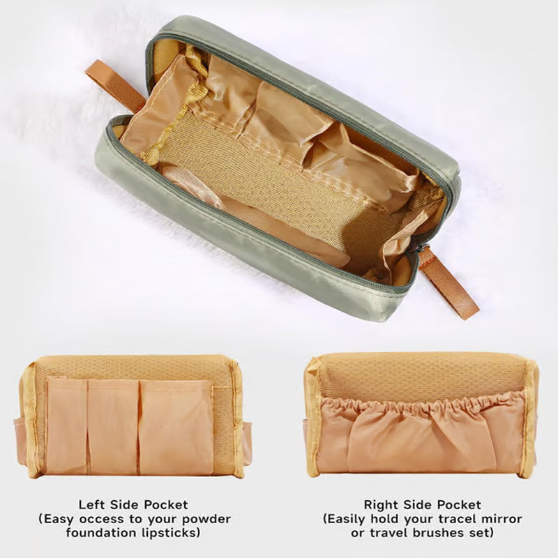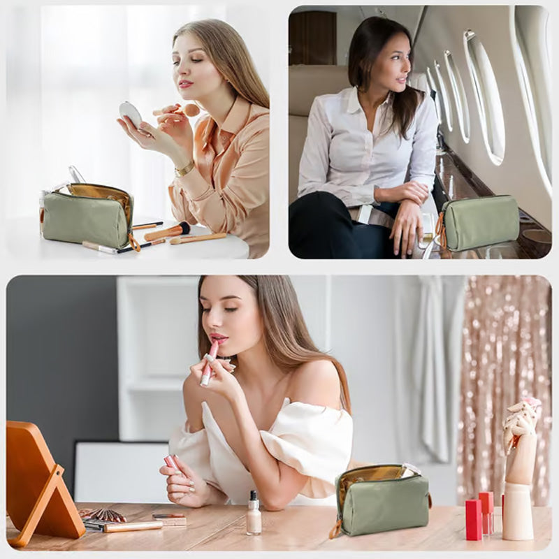 Kvalitetsmateriale: Reisesminkevesken vår er laget av polyester av høy kvalitet, myk og lett, vanntett og vaskbar. Skreddersydde doble glidelåser i mykt skinn, stilig utseende og enkel å bruke.