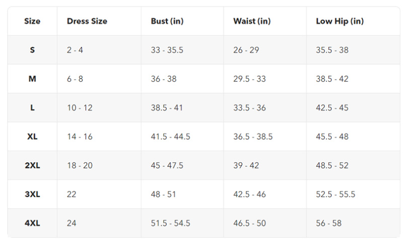 Alle produktene er i henhold til størrelsestabellen nedenfor. Hvis du er mellom to størrelser på grunn av BH-størrelsen, anbefaler vi absolutt å ta en størrelse opp for å sikre at bysten ikke komprimeres og forblir støttet og komfortabel.