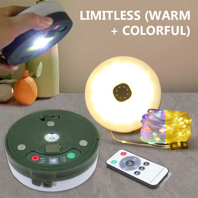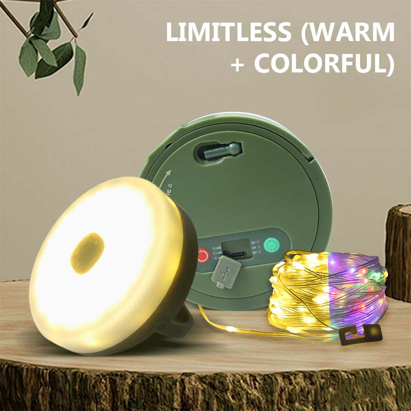Denne kompakte, oppladbare lanternen har varme LED-lys og kan forlenges til 10 meter med vanntett lysslynge, perfekt for å skape stemning. Leveres komplett med magneter og kroker for enkel montering, innebygd powerbank og lommelykt.