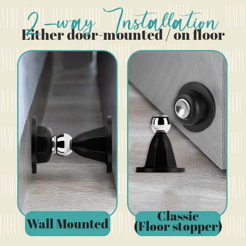Et pålitelig dørstoppverktøy utformet i 2 komponenter med innebygde, kraftige magneter som kan skryte av en utrolig sugeevne. Det holder dører åpne og sikret på plass for å forhindre konstant svinging, voldsomme slag mot vegger og plutselig, kraftig lukking. Dørene og veggene dine skånes mot uønskede skader på grunn av støt og risikoen for å få hendene i klem ved et uhell. Den magnetiske dørstopperen sørger også for at døren ikke slår seg selv under de mest vindfulle forhold. Det er den perfekte løsningen for å holde dører i hjemmet, på soverommet, på barnerommet, på kontoret og mye mer.