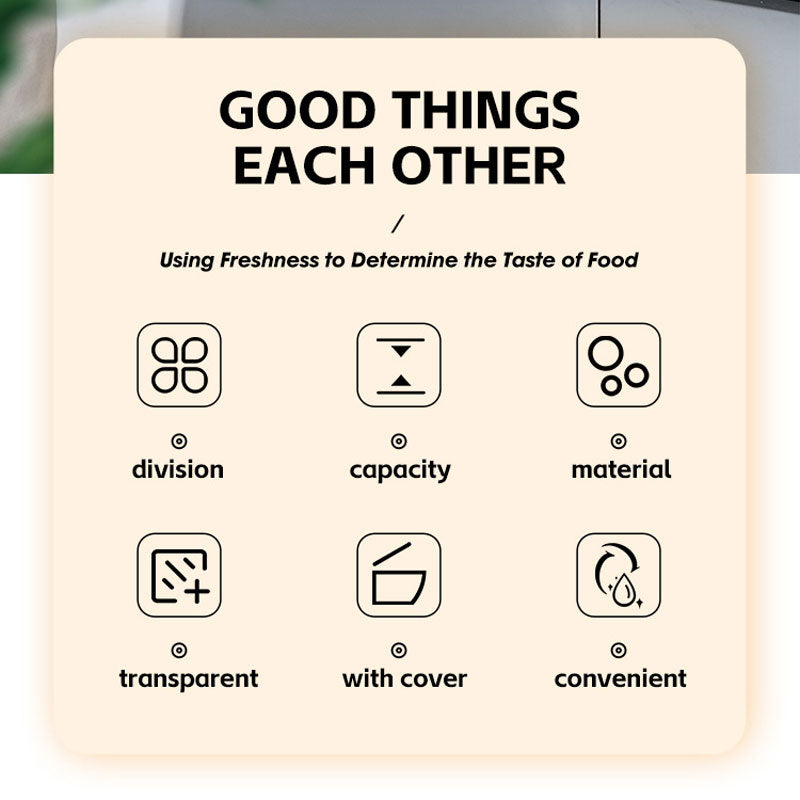 Romdesignet gjør at ulike ingredienser kan plasseres på sine egne steder for å unngå luktblanding og opprettholde en frisk smak. Salater, sauser og frukt er alt i én boks, noe som gjør det enkelt å nyte et sunt liv.