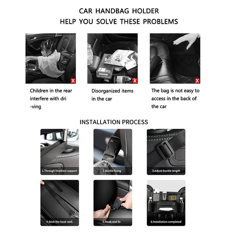 Installasjonen av denne veskeholderen er veldig enkel, ingen boring eller klistremerker kreves, enkel og lett å installere, tar mindre enn ett minutt med det lange nok justerbare 2 øvre og 1 nedre elastiske tauet dekket over konsollens armlener.