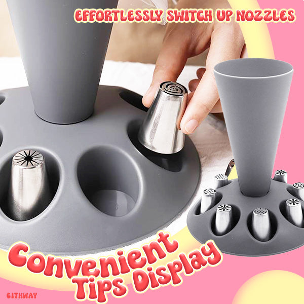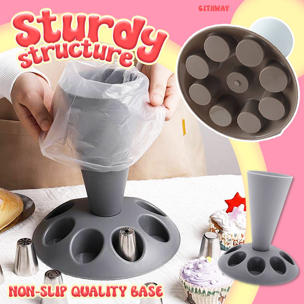 - En unik bakehjelper som er profesjonelt konstruert for å holde kakesprøyteposen din i tillegg til å lagre opptil 8 pyntespisser samtidig. Den lar deg frigjøre begge hendene for enkelt å overføre glasuren eller annen blanding inn i sprøyteposen uten søl i en lek. Dette baketilbehøret lar deg også organisere de nødvendige dysene på ett tilgjengelig sted og enkelt bytte opp når som helst du trenger. Ingen grunn til bekymring siden frostingdyseholderområdet har 8 individuelle spor for å forhindre at alle dyser berører hverandre for å opprettholde maksimal hygiene. I tillegg hjelper det til og med slik at du fritt kan la den fylte sprøyteposen være i fred når som helst for å holde hendene dine for andre oppgaver for maksimal bakemanøvrerbarhet. Gjør den til et flott verktøy for alle de forskjellige kakedekorasjonsprosjektene dine og holder bakeområdet ditt skinnende rent.