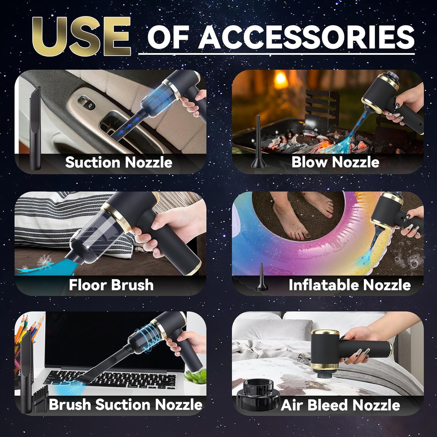 Lei av klumpete støvsugere og sammenfiltrede kabler? Oppdag den bærbare, batteridrevne støvsugeren Air Duster - din alt-i-ett-løsning for støvtørking, blåsing og støvsuging på trange steder. Perfekt for tastaturer, luftventiler i biler, elektronikk og hjørner i hjemmet.