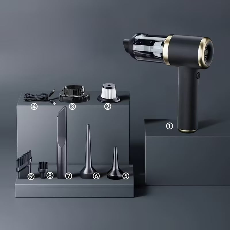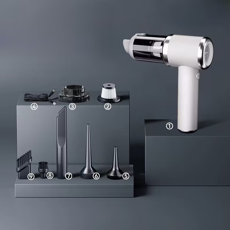 Den håndholdte støvsugeren har fire funksjoner: Støvsuging, blåsing, oppblåsing og støvsuging. Kraftig sugekraft for grundig rengjøring av hver centimeter.