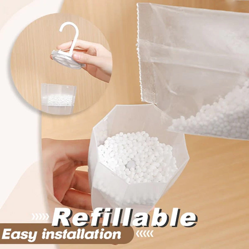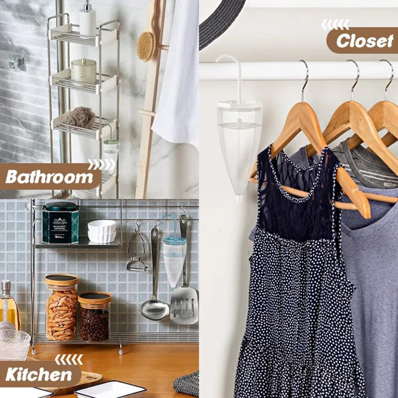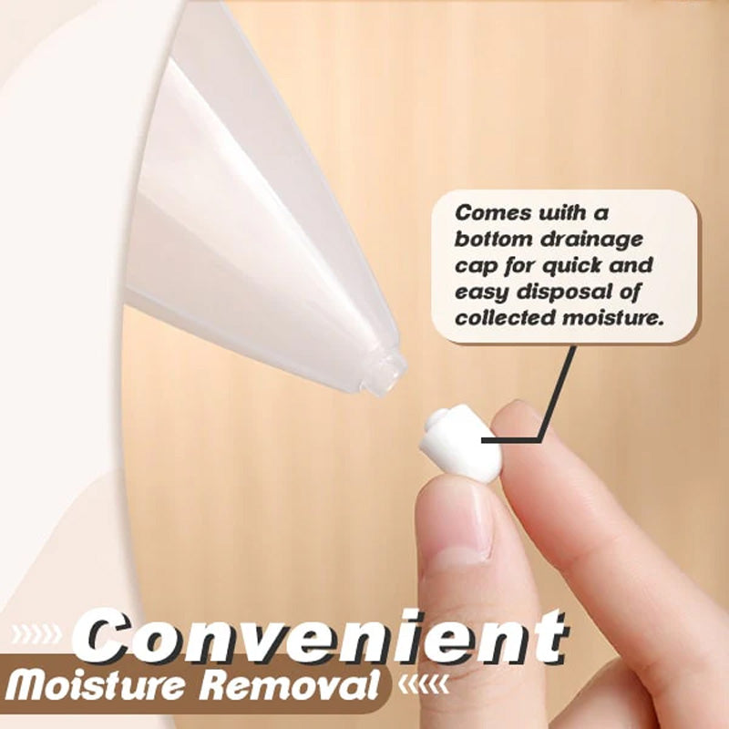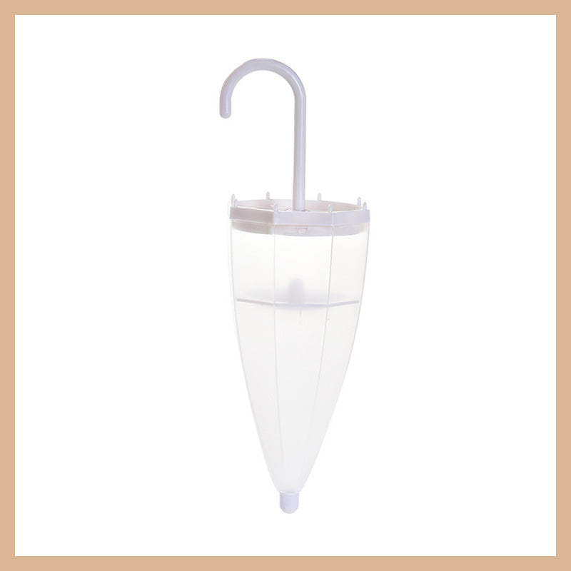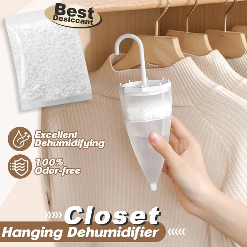 Denne paraplyformede fuktabsorbenten absorberer effektivt overflødig fuktighet fra luften, noe som forhindrer muggvekst, mugg og ubehagelig lukt på klærne. Leveres med en allsidig opphengskrok for praktisk oppheng på lukkede steder med dårlig luftventilasjon og fuktighet, for eksempel garderober, skap, kjøkken, bad, kjellere, garasjer og mye mer.