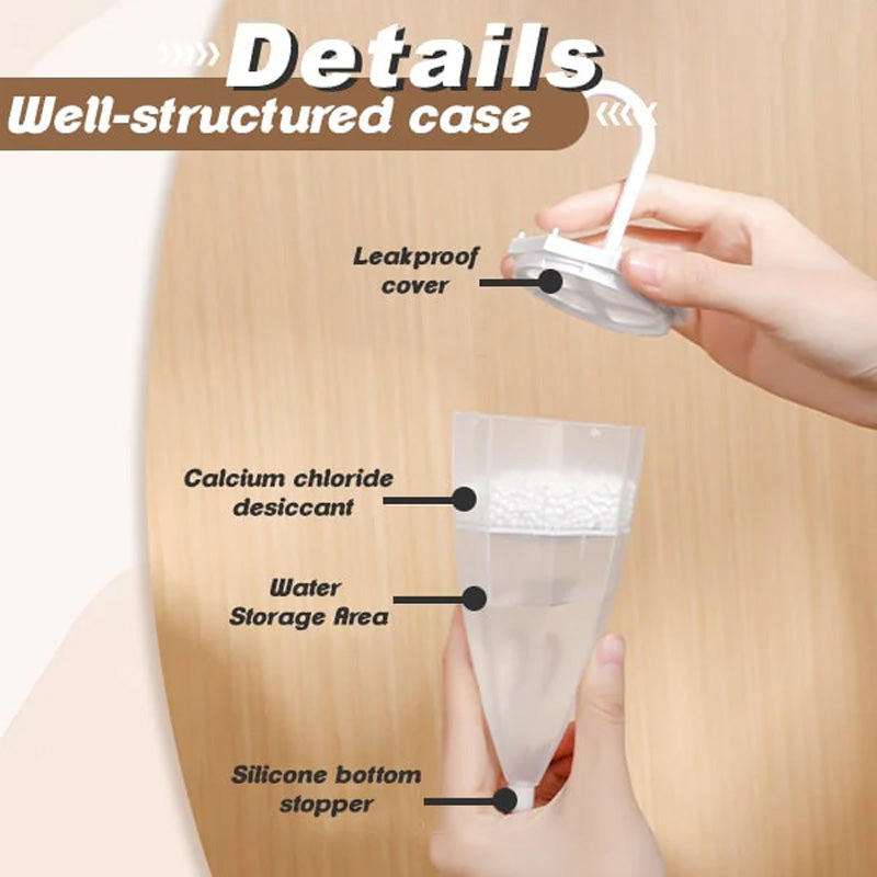 En kostnadseffektiv og samtidig bærekraftig løsning sammenlignet med tradisjonelle fuktabsorberende engangsposer. Har en gjennomsiktig beholder med to lag som skiller tørkemidler og oppsamlet fuktighet. Gjør det mulig å indikere hvor mye av avfallskapasiteten som er brukt og hvor mye tørkemiddel som er igjen;