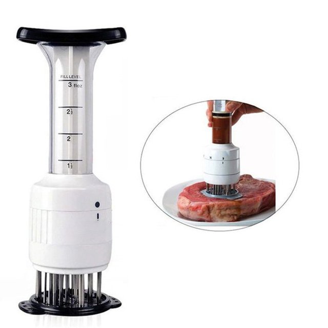 Den har kniver i rustfritt stål som stikker hull i kjøttet for å gjøre det mørere, mens de tre smaksnålene sprøyter inn ønsket marinade.