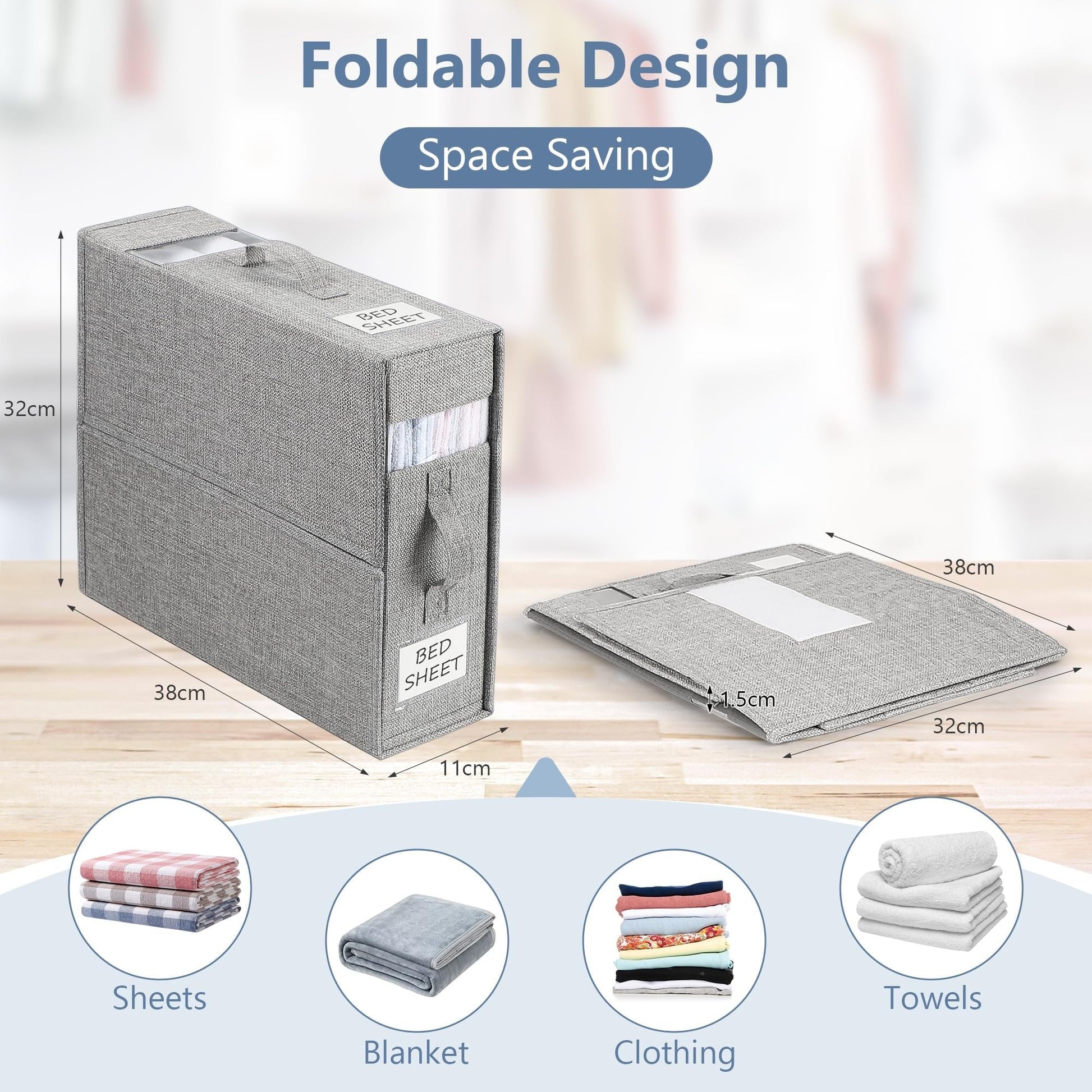 Space Saving Master: Hver måler 38x32x11,5 cm (L*B*H) når den er åpen og 38x32x1,5 cm når den er brettet. Det er en flott plassbesparende hjelper for å organisere queen- eller king-size-sengetøy, dynetrekk, tepper, håndklær og klær, holde skapet rotfritt og skape mer lagringsplass.