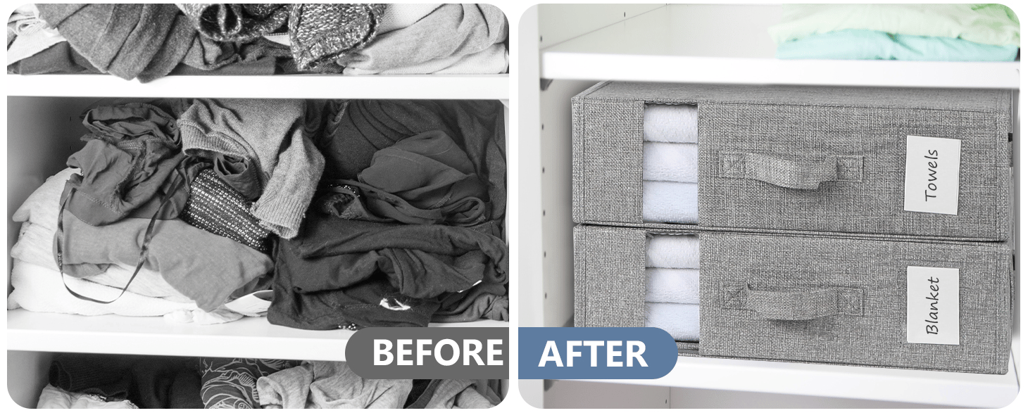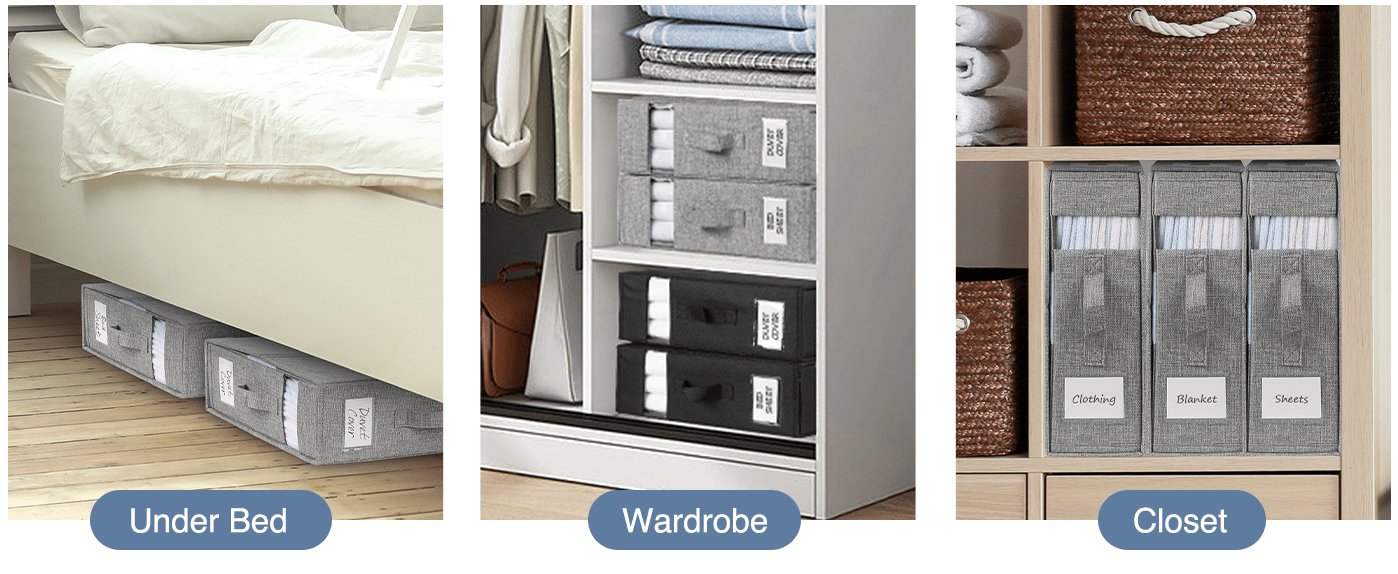 Utbredt bruk: Oppbevaringsboksene våre kan brukes mye til linskap, garderobeskap, skap, hylle, under sengen, under sofaen eller andre steder for å organisere prosjekter. Den er enkel, praktisk og praktisk å betjene, og holder sengetøyet ryddig og ryddig. Arkene vil holde seg på plass og lette å finne uten å kaste bort mer tid på å søke og brette sammen.
