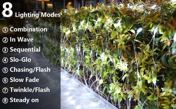 8 moduser med minnefunksjon: Dette nettbaserte julelyset har 8 forskjellige moduser. Kombinasjon, bølge, sekvensiell, Slo-glo, jakt, langsomt forfall, blinkende og stabil. Adapteren til nettlyset har en innebygd minnebrikke som lagrer den siste modusinnstillingen, slik at du ikke trenger å tilbakestille modusen hver dag.