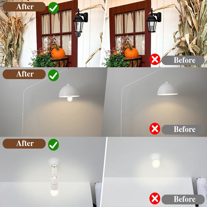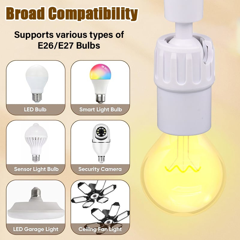Kompatibilitetsapplikasjon: lyspæreforlengeren er kompatibel med vanlige E26/E27 basepærer, for eksempel standardpære, smartpære, bevegelsessensorpære og sikkerhetskamerapære. Mye brukt i stue, spisestue, veranda, garasje, kjeller, etc.