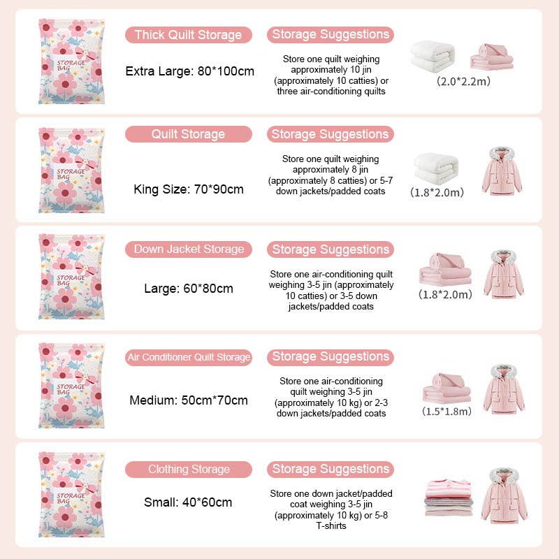 PLASSEFFEKTIVITET: Med muligheten til å redusere lagringsplassen med opptil 75 % er disse vakuumposene en perfekt løsning for å optimalisere lagringen din. Komprimer store gjenstander og frigjør verdifull plass i skapet eller bagasjen.